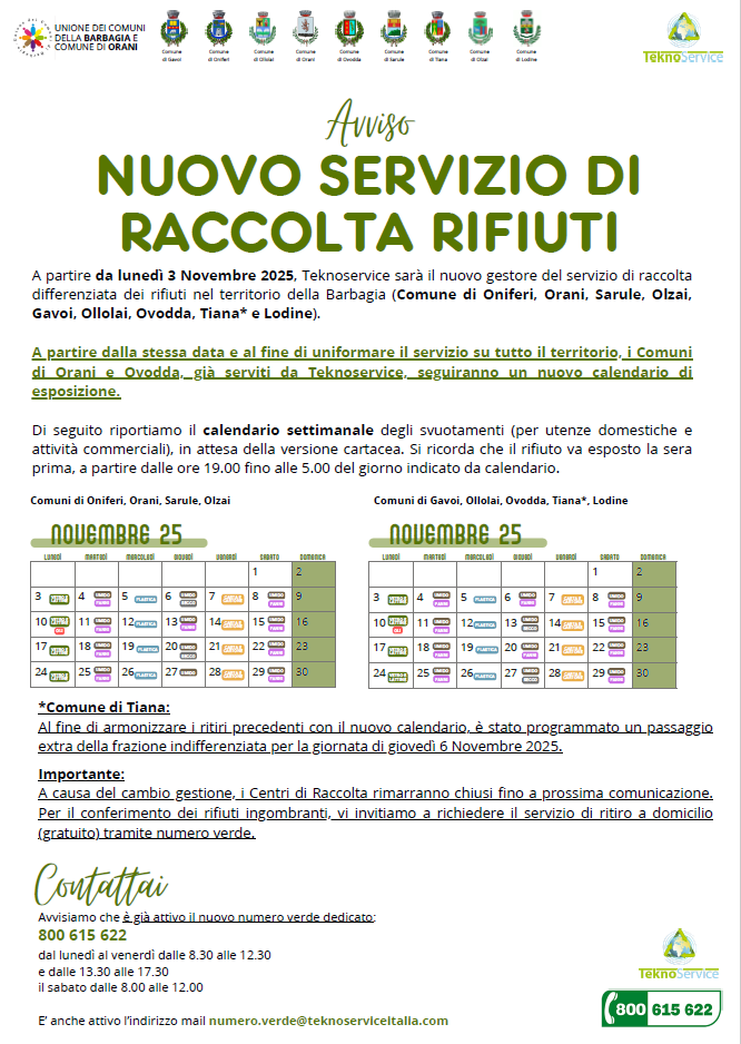 A partire da lunedì 3 Novembre 2025, Teknoservice sarà il nuovo gestore del servizio di raccolta differenziata dei rifiuti nel territorio della Barbagia (Comuni di Oniferi, Orani, Sarule, Olzai, Gavoi, Ollolai, Ovodda, Tiana* e Lodine).