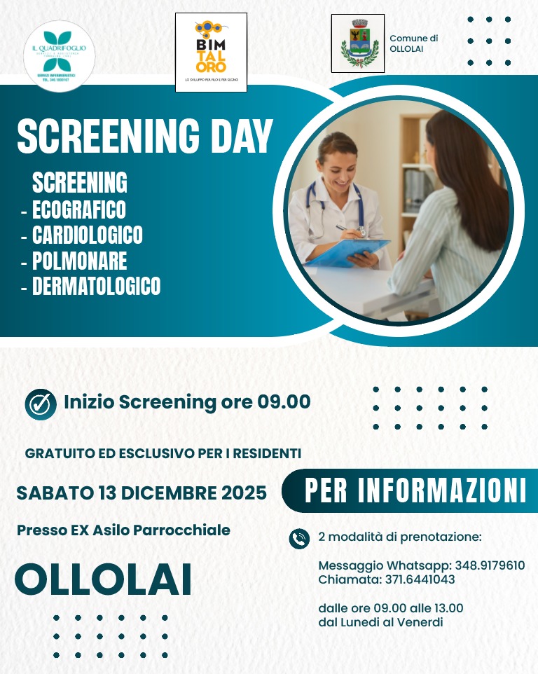 Nel comune di Ollolai lo Screening Day è previsto Sabato 13 dicembre 2025