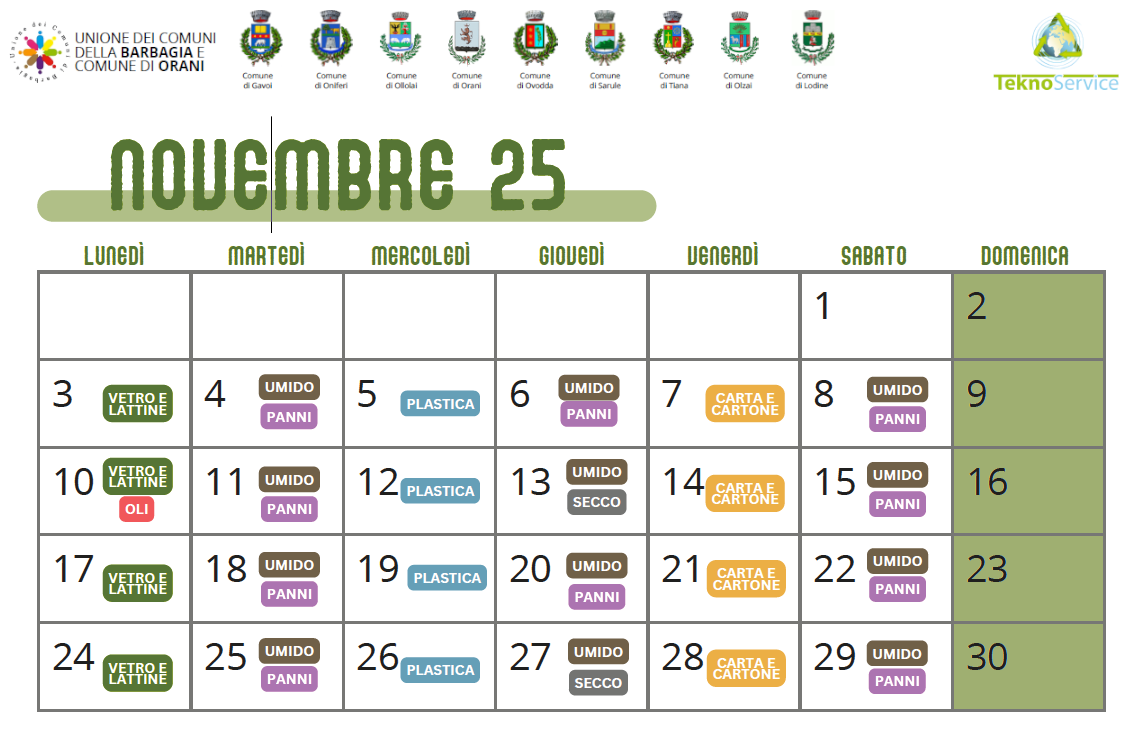 A partire da lunedì 3 Novembre 2025, Teknoservice sarà il nuovo gestore del servizio di raccolta differenziata dei rifiuti nel territorio della Barbagia (Comuni di Oniferi, Orani, Sarule, Olzai, Gavoi, Ollolai, Ovodda, Tiana* e Lodine).