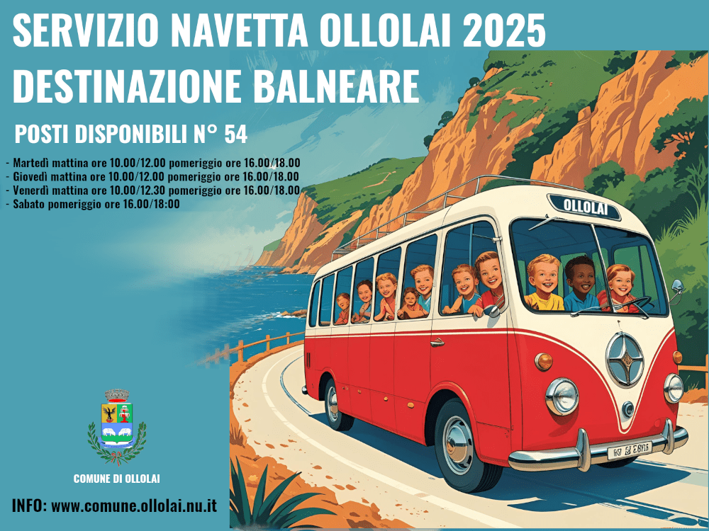 L’Amministrazione Comunale per l’estate 2025 organizza il servizio navetta peraccompagnare i cittadini di Ollolai al mare (posti disponibili nr. 54). Tutti gli interessati dovranno presentare apposita DOMANDA, disponibile sul sitointernet www.comune.ollolai.nu.it e presso la Biblioteca comunale, a partire dal01/07/2025 e nei seguenti GIORNI:- Martedì mattina ore 10.00/12.00 pomeriggio ore 16.00/18.00- Giovedì mattina ore 10.00/12.00 pomeriggio ore 16.00/18.00- Venerdì mattina ore 10.00/12.30 pomeriggio ore 16.00/18.00- Sabato pomeriggio ore 16.00/18:00