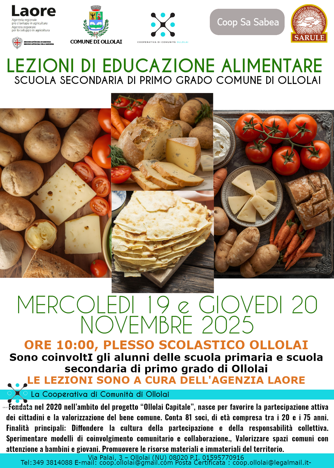 Mercoledì 19 e giovedì 20 novembre, alle ore 10:00, presso il plesso scolastico di Ollolai, si svolgeranno due giornate dedicate all’educazione alimentare per gli alunni della scuola primaria e secondaria di primo grado.