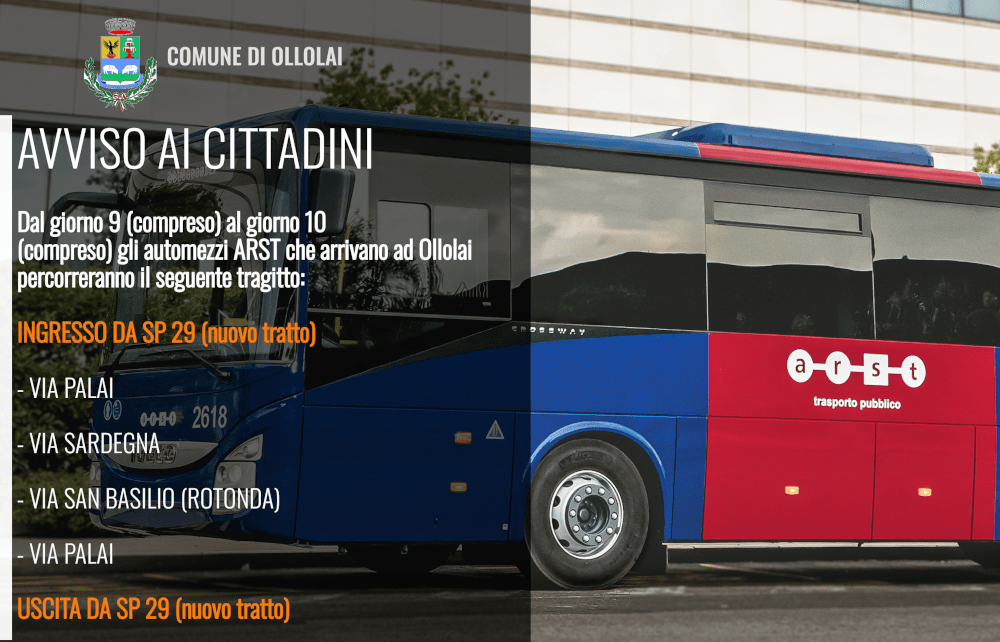 Dal giorno 9 (compreso) al giorno 10 (compreso) gli automezzi ARST che arrivano ad Ollolai percorreranno il seguente tragitto:
