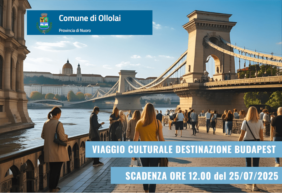 Scadenza ore 12.00 del 25/07/2025 Si informa la cittadinanza che il Comune di Ollolai intende organizzare un Viaggio Culturale digruppo di 4 giorni (3 notti), destinazione “BUDAPEST”;