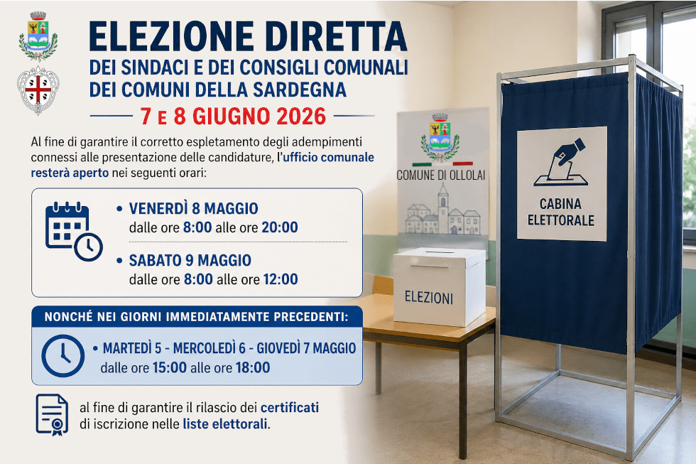 L’Amministrazione Comunale per l’estate 2025 organizza il servizio navetta peraccompagnare i cittadini di Ollolai al mare (posti disponibili nr. 54). Tutti gli interessati dovranno presentare apposita DOMANDA, disponibile sul sitointernet www.comune.ollolai.nu.it e presso la Biblioteca comunale, a partire dal01/07/2025 e nei seguenti GIORNI:- Martedì mattina ore 10.00/12.00 pomeriggio ore 16.00/18.00- Giovedì mattina ore 10.00/12.00 pomeriggio ore 16.00/18.00- Venerdì mattina ore 10.00/12.30 pomeriggio ore 16.00/18.00- Sabato pomeriggio ore 16.00/18:00