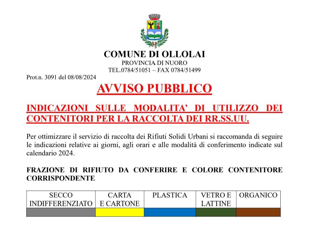 AVVISO PUBBLICO: INDICAZIONI SULLE MODALITA’ DI UTILIZZO DEI CONTENITORI PER LA RACCOLTA DEI RR.SS.UU.